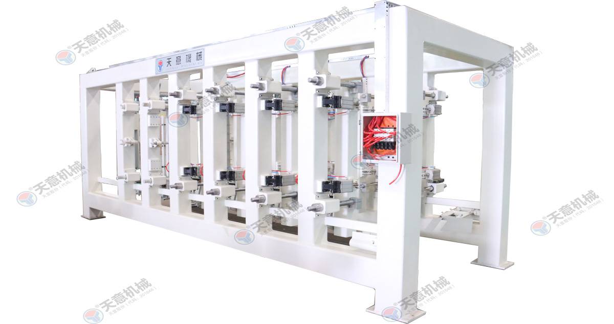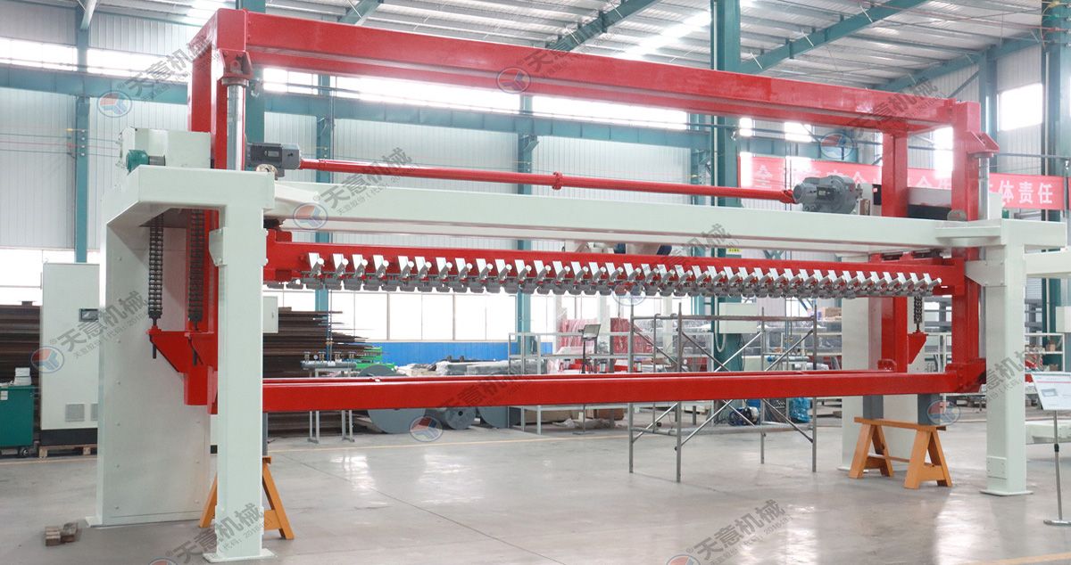 翻轉(zhuǎn)吊機:抓取模箱翻轉(zhuǎn)90°,側(cè)立在切割小車上進行切割;切割工段空翻脫模機將??蚍D(zhuǎn)90°,放在切割小車支座上進行脫模,脫模后的??蚺c清理后的側(cè)模板進行合模,合膜后的空模框被吊運至模具回程軌道上進行涂油處...