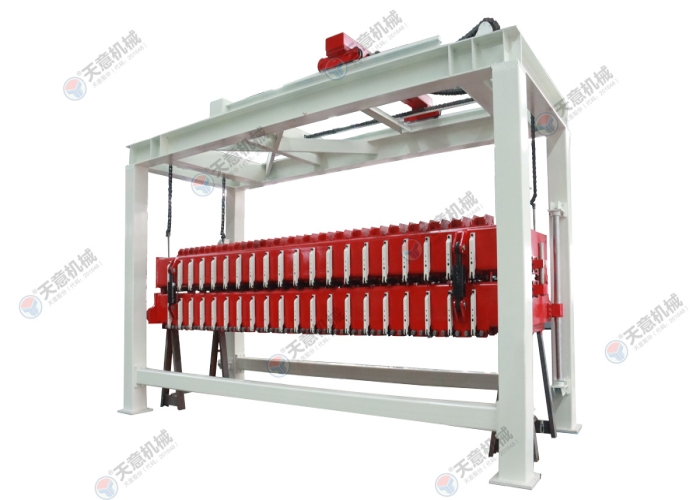脫模后的坯體連同側(cè)板一起放置在切割小車上,切割小車由減速電機(jī)驅(qū)動(dòng)行走,通過縱向切割機(jī)完成縱向切割,切割小車?yán)^續(xù)行走至橫向 切割機(jī)中間位置停止后,由小車置換裝置將側(cè)板連同坯體抬起,切割小車退回翻轉(zhuǎn)行車底下進(jìn)行下一次承載脫模后的坯體,另外一部切割小車 進(jìn)入置換裝置底下后, 置換裝置將側(cè)板連同坯體放置該切割小車上后,橫向切割動(dòng)作后啟動(dòng)進(jìn)行橫向切割動(dòng)作,切割完成后,切割小車再行走至確地行車底下,再由 翻轉(zhuǎn)去底行車將坯體去底(連側(cè)板)吊至蒸養(yǎng)小車上,切割小車范圍原始位置進(jìn)行下一個(gè)切割循環(huán)。