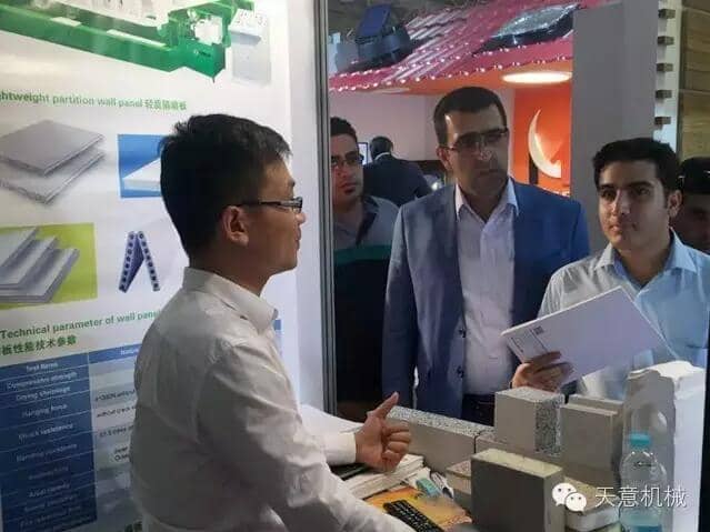 展會(huì)上,天意機(jī)械銷(xiāo)售經(jīng)理劉春剛細(xì)心的向前來(lái)咨詢(xún)的客戶(hù),介紹了天意綠色建筑建材裝備在建筑行業(yè)內(nèi)的應(yīng)用優(yōu)勢(shì),通過(guò)觀看產(chǎn)品應(yīng)用視頻以及展現(xiàn)成品樣塊,使得天意展位前門(mén)庭若市。期間,外貿(mào)部銷(xiāo)售經(jīng)理劉春剛,專(zhuān)程拜訪了天意公司在伊朗年產(chǎn)50萬(wàn)平方的輕質(zhì)墻板生產(chǎn)線合作伙伴。詳細(xì)了解客戶(hù)的生產(chǎn)情況,幫助客戶(hù)免費(fèi)升級(jí)技術(shù)配方降低成本。