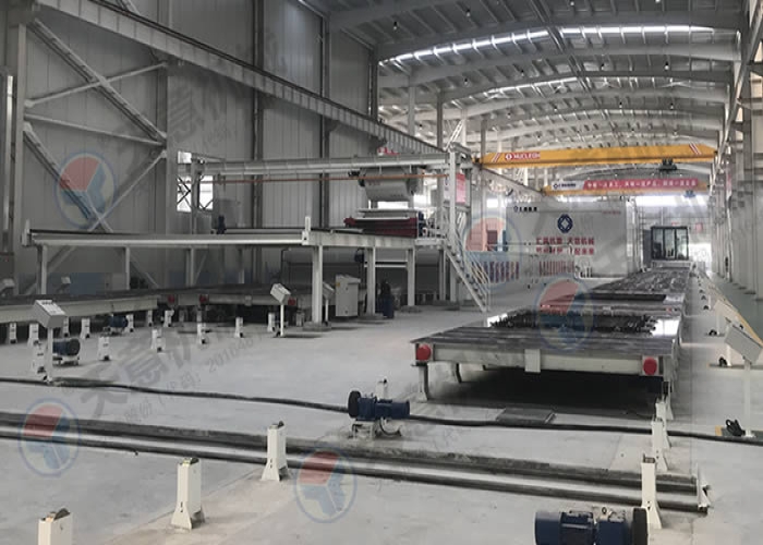 PC環(huán)形疊合板生產(chǎn)線采用高精度、高結(jié)構(gòu)強(qiáng)度的成型模具,經(jīng)自動布料機(jī)把混凝土澆筑其中、振動臺振搗后并不立即脫模,而是經(jīng)預(yù)養(yǎng)護(hù)、蒸汽養(yǎng)護(hù),使構(gòu)件強(qiáng)度滿足設(shè)計(jì)強(qiáng)度時才進(jìn)行拆模處理,拆模后的成品構(gòu)件運(yùn)輸至成品暫存區(qū)或室外堆場,而空模臺沿輸送線自動返回,形成自動化環(huán)形流水作業(yè)。